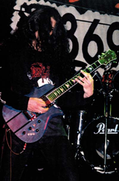 The show itself was a lot of fun. We'd gotten any initial jitters out of the way when we played Houston and Corpus Christi in March. I'd grown accustomed to playing our super fast and technical tunes in a live situation and wasn't as sloppy as I'd been on our maiden voyage in Houston. Though Breathe Deep wouldn't be released in America until September, we played about 90% of the album that night in Fullerton. Only "Clutching at Straws" was missing from the set list. I was personally stoked because my fave axe, a 1981 B.C. Rich Seagull, was finally back in commission for the gig. I had a lot of trouble with it in January. The bridge/tailpiece died and thanks to Il NiƱo the neck was beginning to warp. I was bummed that I couldn't record more than two clean guitar sections on Breathe Deep with the Seagull. It was/is big 'n' beefy.